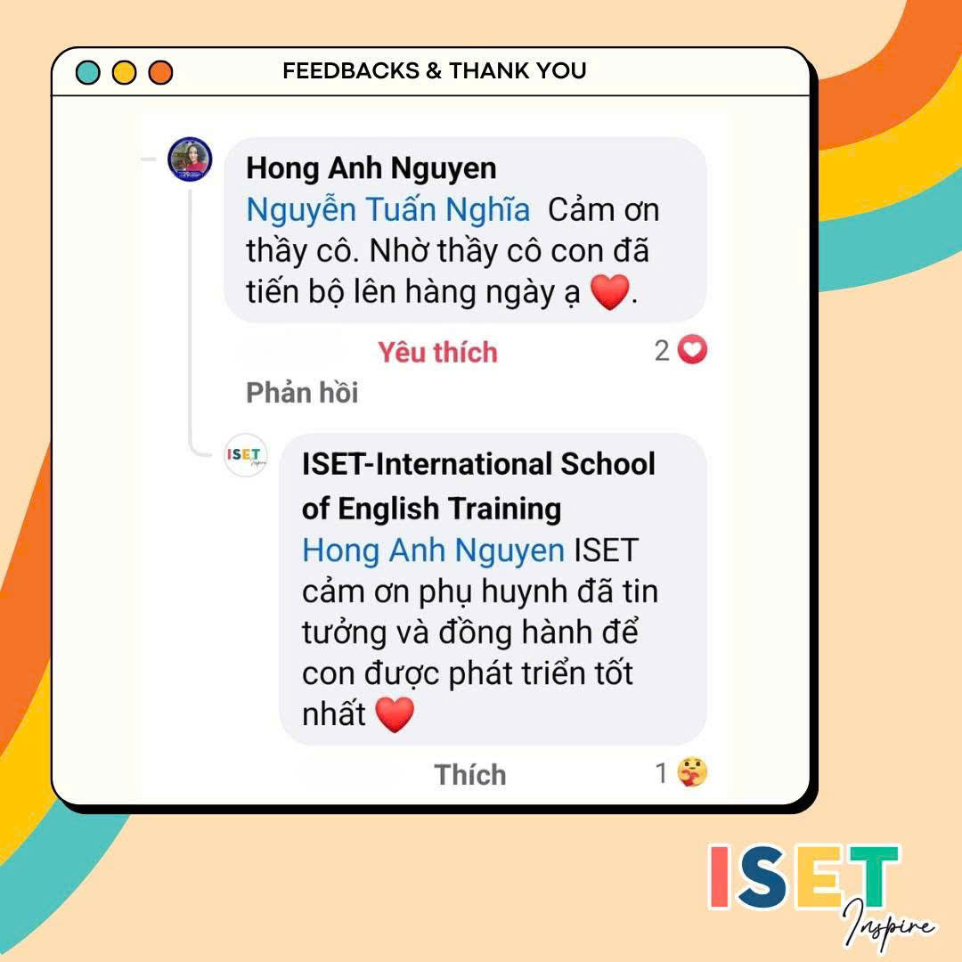 Tại ISET – International School of English Training, học sinh được học tiếng Anh trong môi trường tương tác, hoạt động thực tế và chương trình chuẩn quốc tế, kết hợp giữa tiếng Anh tự nhiên và tiếng Anh học thuật. Nhờ vậy, các em không chỉ nói được tiếng Anh mà còn hiểu, phân tích và sử dụng tiếng Anh trong học tập và cuộc sống.